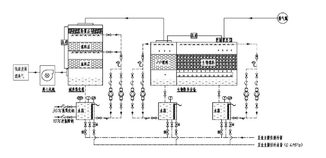 | 恶臭气体 | → 收集系统 | → 预洗系统 | → 过滤系统 | → 离心风机 | → 排放系统 |